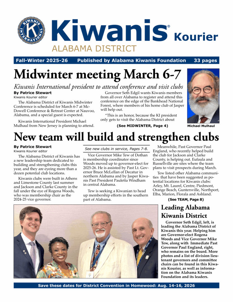 Welcome to the Alabama District of Kiwanis International! We’re glad you’re here and invite you to explore how Kiwanians across our great state are making a meaningful difference in the lives of children and families—one community at a time. From service projects that inspire hope to partnerships that strengthen neighborhoods, Alabama Kiwanians are committed to improving the world by serving others. We encourage you to visit one of our many local clubs, experience the fellowship that drives our mission, and discover how connection, compassion, and service can create lasting impact in our communities and beyond. –Governor Seth Edgil
